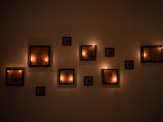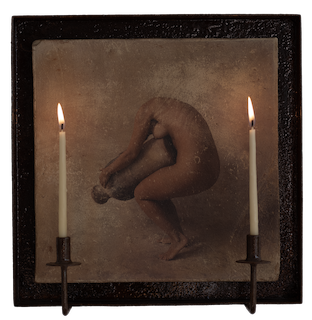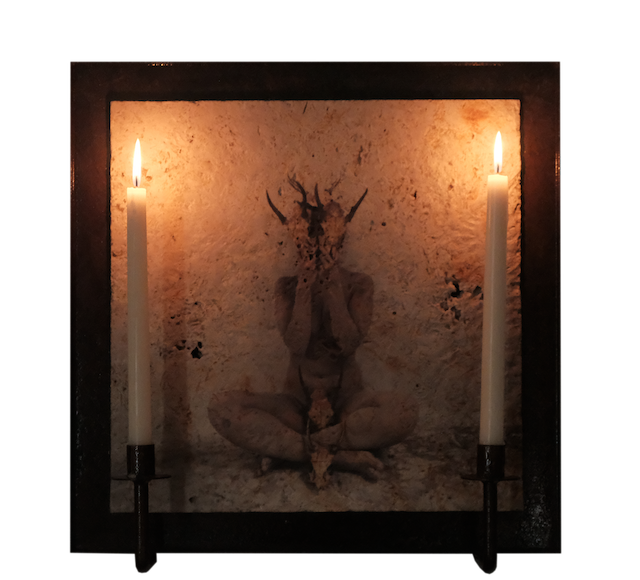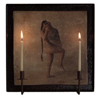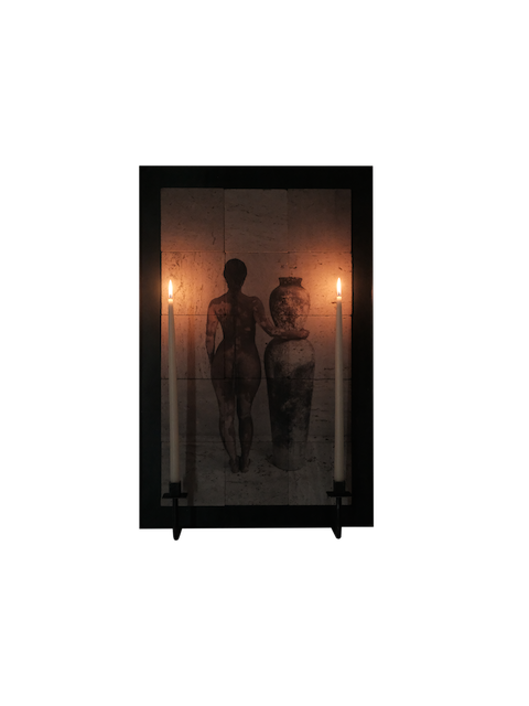 Imagen impresa en mamol travertino con marco de patina de acero y candelabro