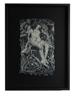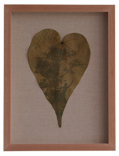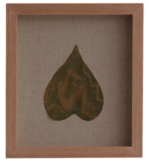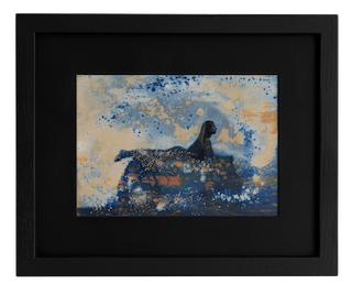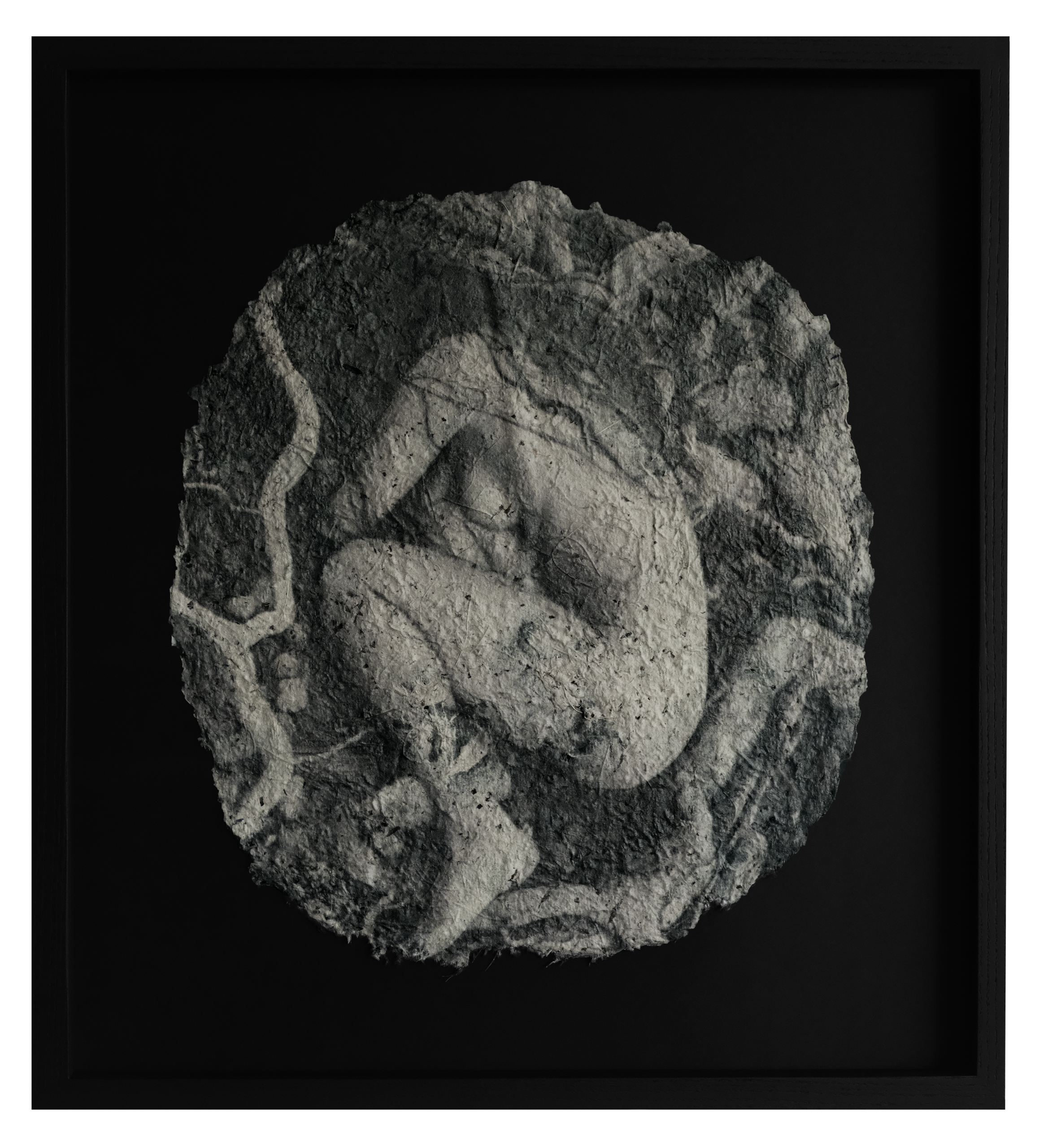 Imagen impresa en papel de alga con marco de madera y cristal de museo.