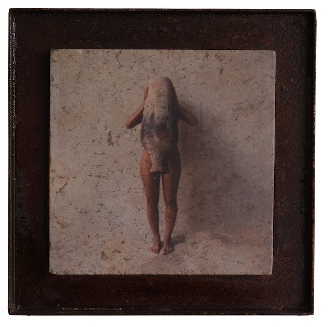 Imagen impresa en mármol travertino en patina de acero oxidado